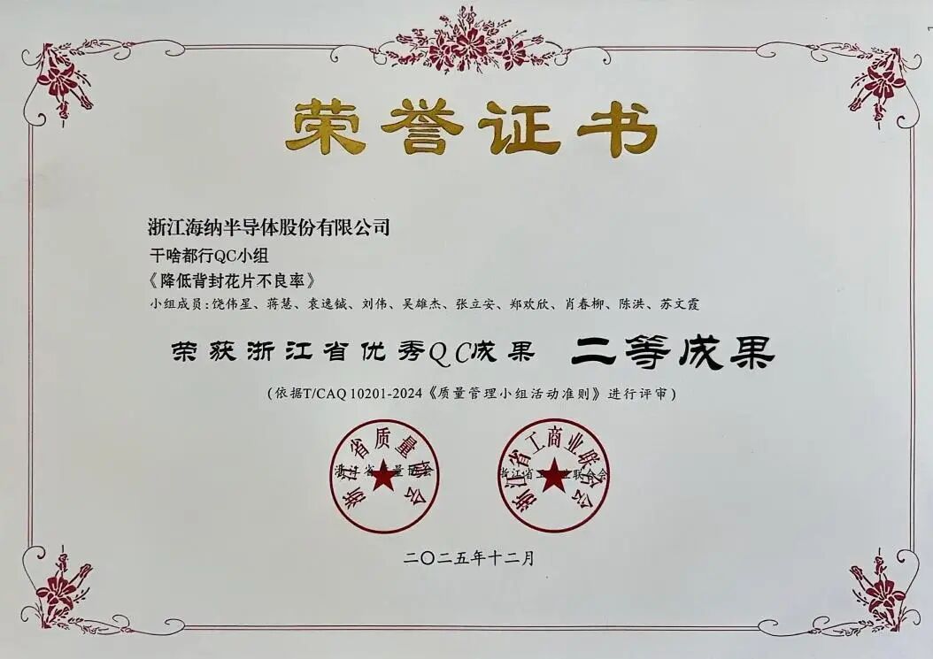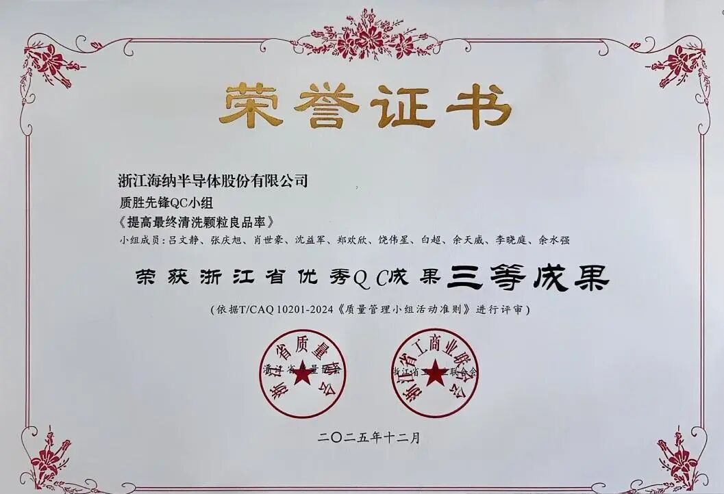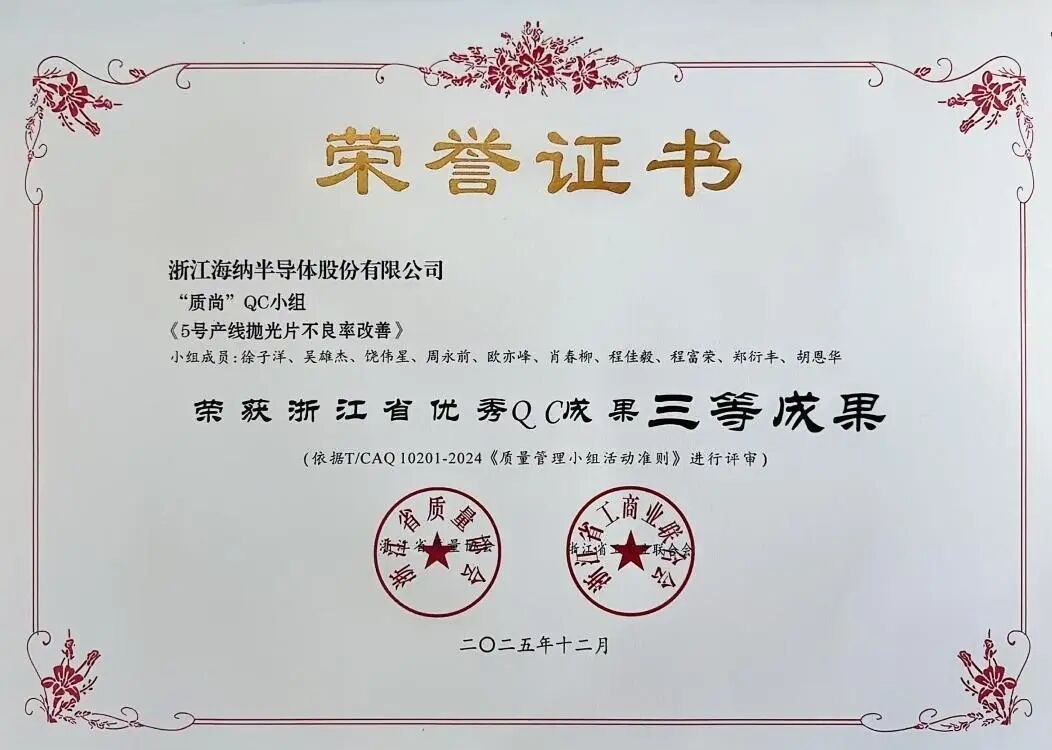 克日,,,,,浙江省质量协会、浙江省工商业团结会团结宣布《关于宣布2025年度浙江省优异质量治理小组效果、质量信得过班组典范履历及质量治理论文评价效果的通知》,,,,,浙江海纳半导体股份有限公司(以下简称“公司”)依附深挚的质量治理积淀与手艺立异实力,,,,,斩获三项省级优异QC效果声誉——“降低背封花片不良率”获评二等效果,,,,,“提高最终洗濯颗粒良品率”“5号产线抛光片不良率改善”双双获评三等效果,,,,,标记着公司在半导体制造历程质量管控、工艺优化领域的实践探索获得省级权威认可。。。 。。。。