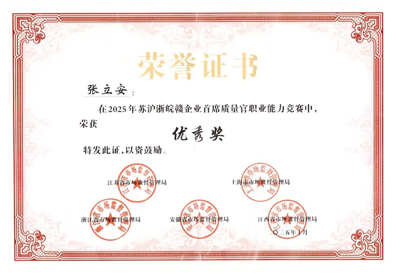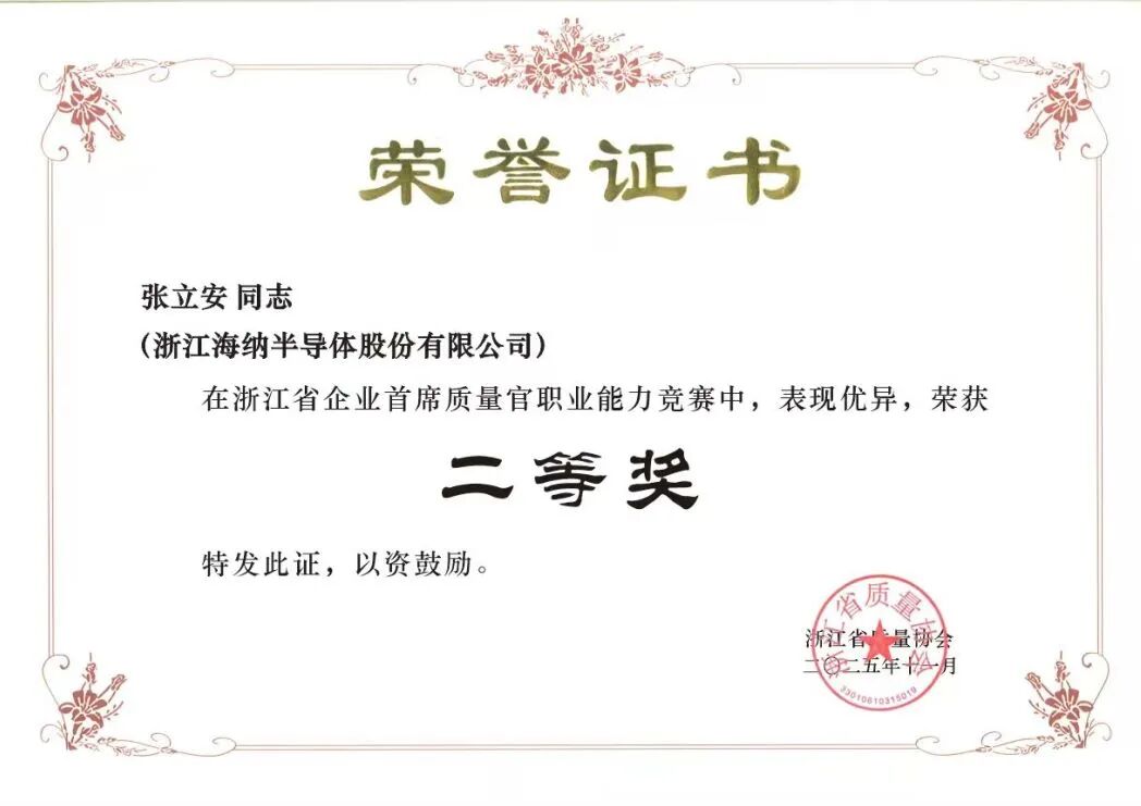 在公司QC小组斩获省级多项声誉的同时,,,,,小我私家质量领域的风范同样熠熠生辉。。。 。。。。浙江海纳半导体股份有限公司副总司理张立安,,,,,依附扎实深挚的专业积淀、富厚成熟的质量管控履历,,,,,在2025年度质量领域赛事中屡创佳绩——不但在浙江省企业首席质量官职业能力竞赛中体现突出,,,,,荣膺二等奖,,,,,更在笼罩苏沪浙皖赣五省的企业首席质量官职业能力竞赛中脱颖而出,,,,,一举斩获优异奖。。。 。。。。小我私家卓越引领团队精进,,,,,从专业竞技的亮眼体现到手艺攻关的整体突破,,,,,海纳人以“小我私家强”发动“团队优”,,,,,用多元实践深耕质量治理初心,,,,,为企业高质量生长注入源源一直的强劲动力。。。 。。。。